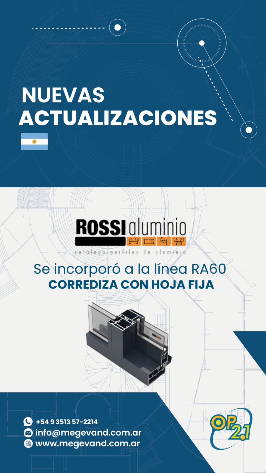 El sistema OP2.1 se actualizó con las últimas configuraciones de Rossi Aluminio. Los usuarios ya pueden acceder a la nueva tipología RA60 corrediza con hoja fij...